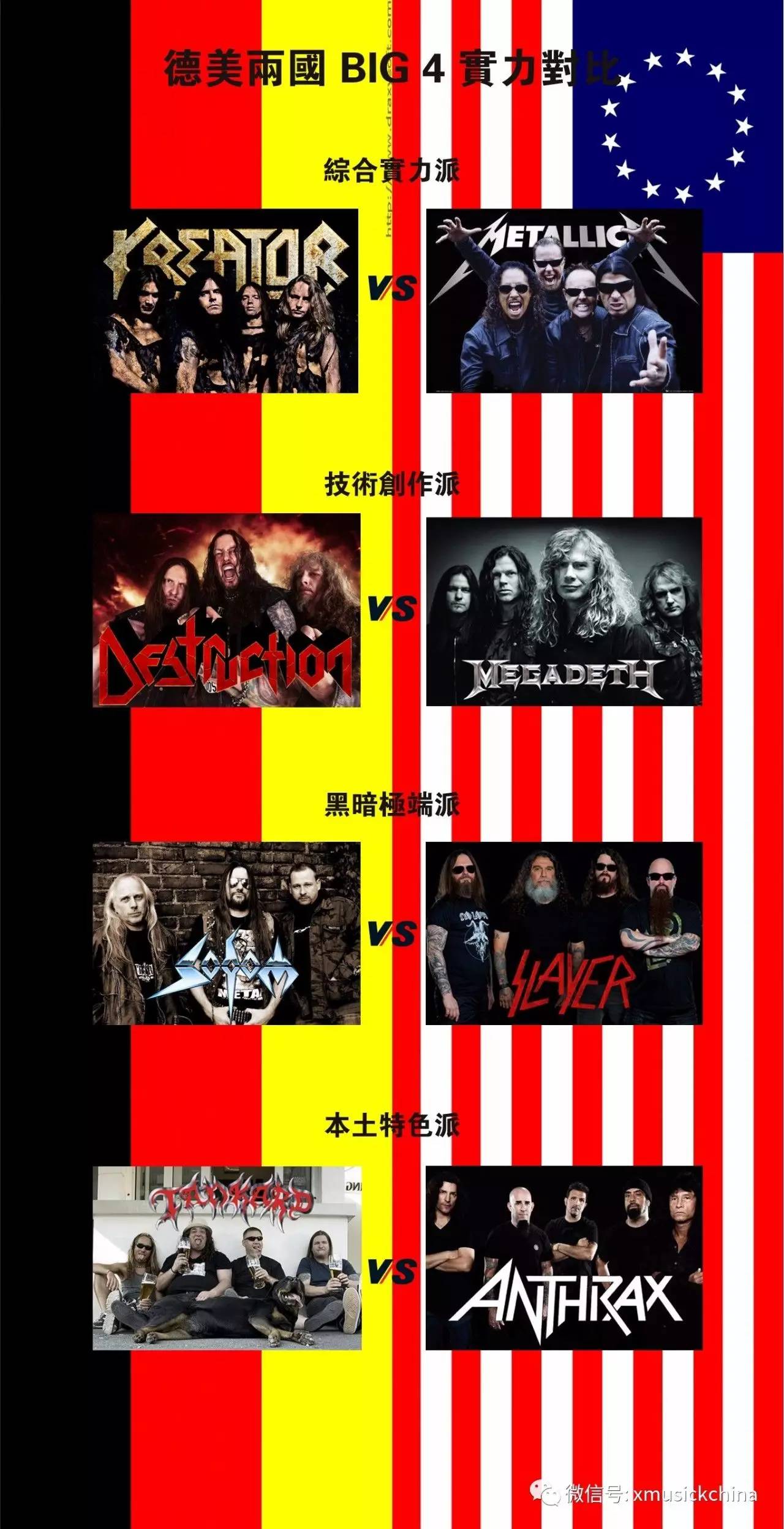 我们根据两个阵营中乐队各自特色,来对阵相应乐队,可以看到实力差距还是很悬殊的。德国 BIG4 从销量,知名度以及演出规模,基本只能和美国准一线激流实力相当,如 TESTAMENT、 EXODUS、OVERKILL 等。如果不是比拼硬指标,只是比较个人感受,那么各花入各眼,可能有异议。我们也只是从数据来分析。音乐本身个人感受是很难比对的。