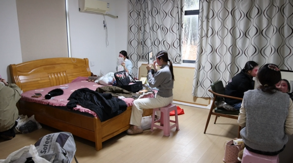 上午九点,50多名台州乱弹演职人员陆续抵达,其中,不少“00后”青年演员都是首次深入偏远山区演出。村里没有专业化妆间和服装间,大家就在村民家中找个角落,有条不紊地准备演出前的各项工作。
