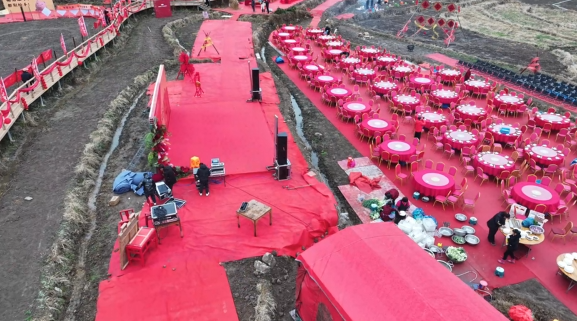 上午十点,距离演出不到半小时,意外再次出现——田间湿气上涌,舞台地毯变得潮湿。为确保演出效果,舞美人员立即动手,重新铺设地毯。